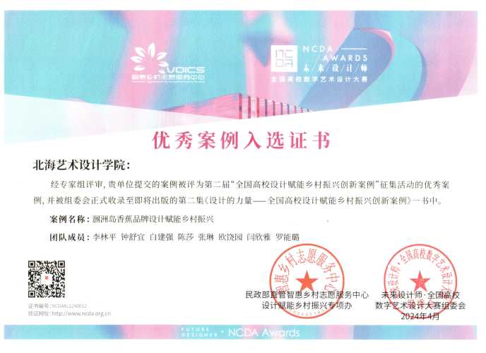 设计赋能乡村振兴创新教育学术活动是本届“高博会”的重要组成部分,活动以“赋能乡村振兴 共富美丽中国”为主题,聚焦乡村文化、教育创新、人才培养、赛教融合等热点话题,来自全国各地的专家、学者围绕设计赋能乡村振兴相关领域的知识前沿与创新实践,进行了全方位、多维度、深层次的交流。同步举办了未来设计师大赛组委会与民政部直管智惠乡村志愿服务中心共同发起的“我为乡村做设计”表彰活动,我院李林平、钟舒宜、白建强、陈莎等老师指导,学生张琳、欧饶、闫欣雅、罗能璐等完成的“涠洲岛香蕉品牌设计赋能乡村振兴”设计案例成功入选2023年第二届“全国高校设计赋能乡村振兴创新案例”。学校荣获“全国高校设计赋能乡村振兴志愿服务先进单位”。