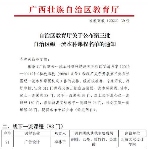 近日,根据《自治区教育厅关于公布第三批自治区级一流本科课程名单的通知》(桂教高教〔2022〕30号),我院李林平负责的 《广告设计》课程认定为自治区级线下一流本科课程。