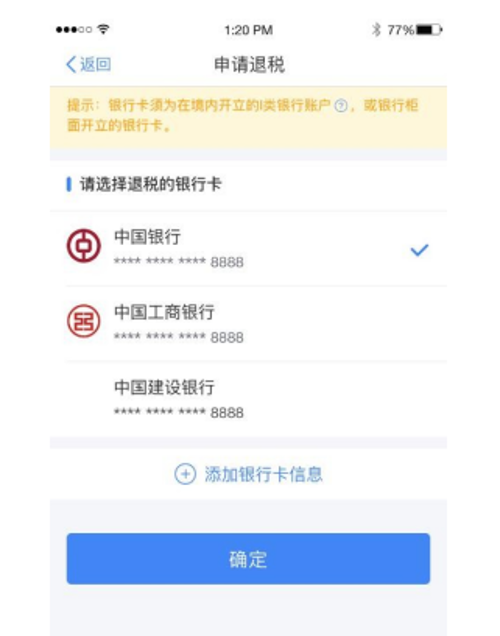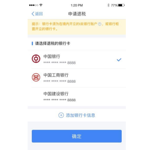Ø 划重点 6:添加退税银行卡,除可在退税申请时进行添加外,还可以通过【个人中心】-【银行卡】模块添加。