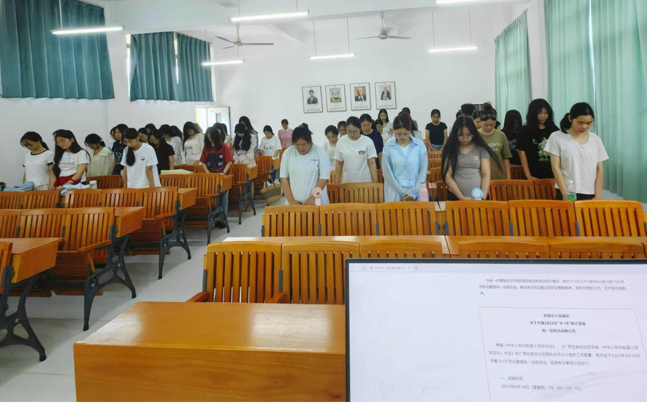 与此同时,在《新闻采访与写作》的课堂上正开展着另一场特殊的爱国主义教育。918日上午,当防空警报响彻校园,党员教师文春明组织学生肃立默哀,缅怀先烈。默哀的分钟里,教室鸦雀无声,学生们挺直腰背、神情肃穆,对历史的敬畏与对先烈的缅怀在无声中传递。后续授课内容围绕“马克思主义新闻观”展开,文春明老师结合“九一八”与今年九三阅兵等思政元素,通过课件图文、视频展示及富有激情的语言深化教育,展现了一场生动的思政课堂。文春明老师在课程中融入思政元素、实现思政教育与课堂场景自然结合的这一教学做法得到了教育督导的高度肯定。
