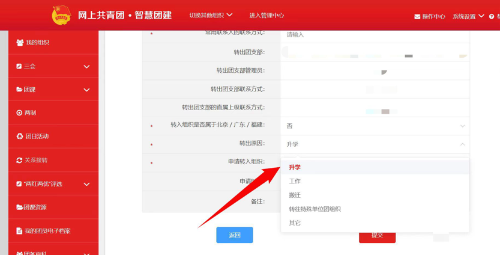4.选择转出团支部、转出人姓名、转入组织是否属于北京/广东/福建、转出原因和转入组织等。提交申请,在转入组织的管理员审批同意后,转接完成。