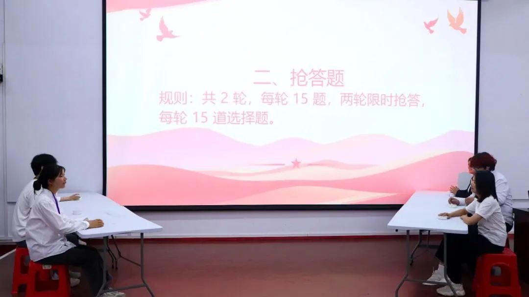 在分享环节后,活动进入紧张激烈的五四知识问答竞赛环节。竞赛围绕五四运动、党史知识、团史知识等内容展开,采用必答题、抢答题等形式进行。现场气氛热烈,同学们踊跃参与,展现出扎实的知识储备和积极向上的精神风貌。