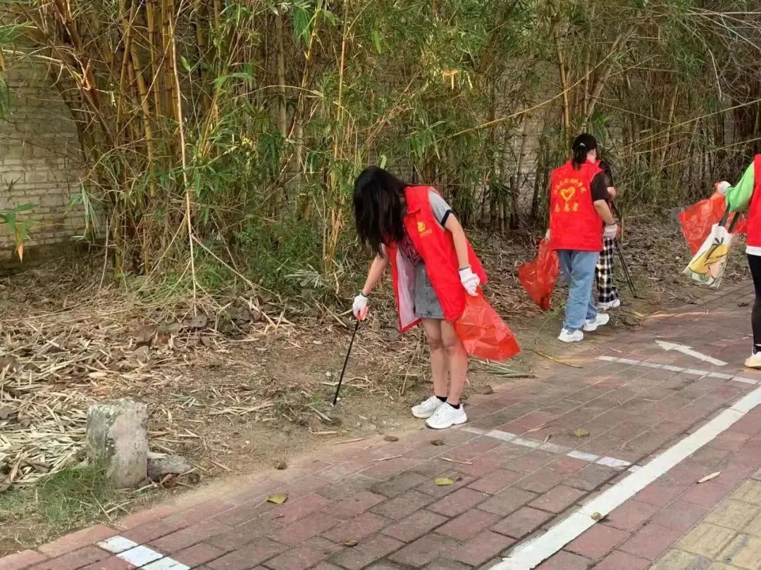 志愿者整装完毕,手持垃圾袋、钳子等清洁用具在学校周边开始行动,对绿化带、人行道等地方进行着重清理,用实际行动让街道恢复了原本干净整洁的样子。