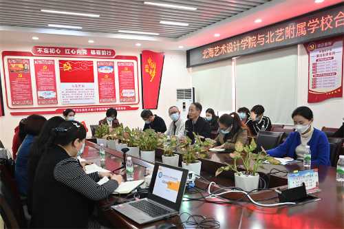 郭庆教授和考察团队一行到北海艺术设计学院附属学校“校校协同”项目进行考察。该校校长包玉红热情欢迎考察团队的来访,并带领考察团参观学校环境。在校训“道德”石碑前,包校长向郭教授及考察团成员介绍了两校一衣带水,一脉相承的历史渊源,对两校的合作过程中北艺对附校的帮助与支持表示感谢。随后一行人在北艺附校会议室进行了深入的座谈和交流。