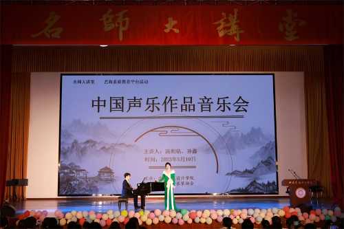 音乐会过程中,孙鑫教授结合歌曲背景及作品内涵,以《玫瑰三愿》为开场曲目赢得台下热烈的掌声,紧接着,她倾情演唱《春思曲》《红绣鞋》《关雎》《那就是我》《青玉案》《眺望》,在音乐的变幻中,情感层层推进,情绪愈涌愈烈,使现场听众思绪久久沉浸其中。汤泽铭教授深沉婉转的歌喉抒发着《怀念曲》的深切情感,他接连唱响《我住长江头》《明月几时有》《恒山月》《大江东去》《我爱祖国的蓝天》,歌声蔓延流转,意境悠远,演绎出音乐作品的层层美感。