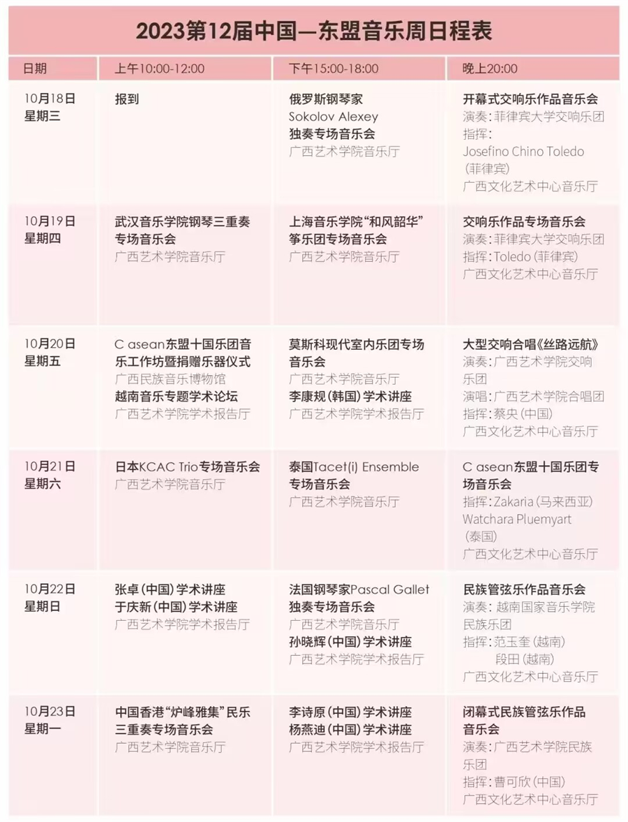 10月18日-10月23日,2023年第12届中国—东盟音乐周在广西南宁举行。人文教育学院艺术教育教研室在学校、学院领导的支持和带领下,由副院长李谦带队,组织音乐教师考察团分批前往音乐周现场进行学习考察。