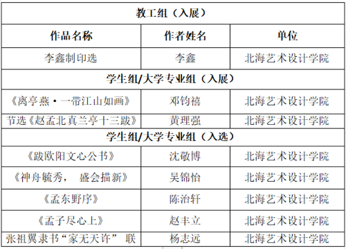 近日,“园丁杯”广西教育系统第八届书法篆刻作品展结果公布,我校书法学院教师李鑫及七名学生入围了“园丁杯”广西教育系统第八届书法篆刻作品展,其中李鑫老师及两名学生荣获入展级别,五名学生荣获入选级别。