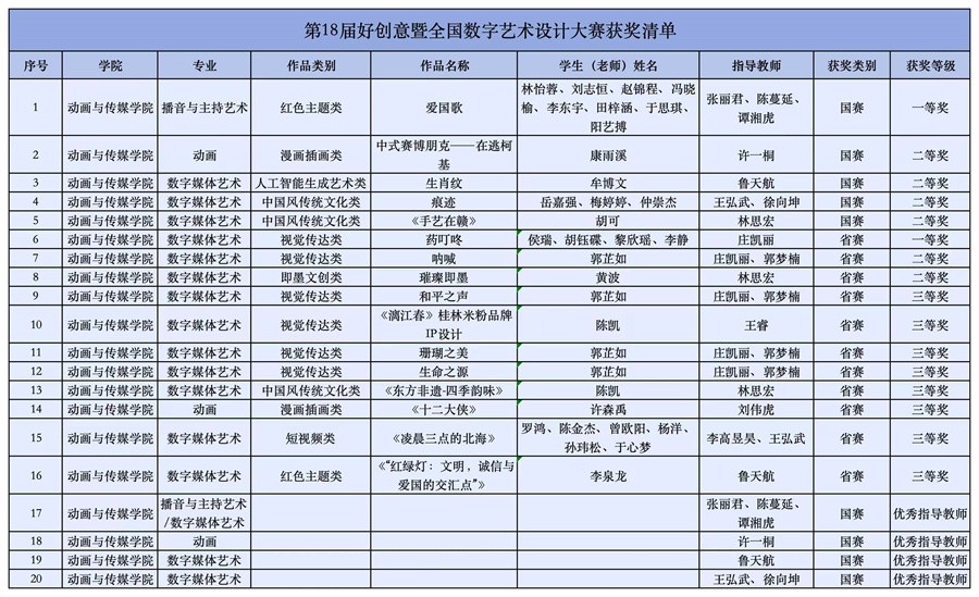 在第18届好创意暨全国数字艺术设计大赛中,动画与传媒学院作品《爱国歌》斩获国赛一等奖,作品《中式赛博朋克——在逃柯基》《生肖纹》《痕迹》《手艺在赣》荣获国赛二等奖,《药叮咚》《呐喊》《璀璨即墨》等11件作品荣获广西壮族自治区省赛奖项。学院张丽君、陈蔓延、谭湘虎、许一桐、鲁天航、王弘武、徐向坤7名老师获评为优秀指导教师。
