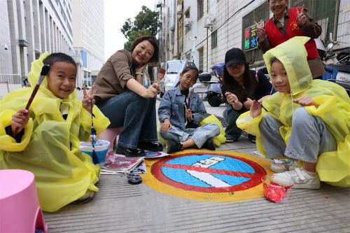 我校大学生创新创业训练计划项目《“艺术疗愈”公益项目》的团队成员志愿者,与参加活动的孩子和家长分成若干小组,发挥想象力,设计创作出风格多样、色彩丰富的图案,手持画笔,挥洒色彩。不久,在医院喷泉旁、发热门诊前、内科楼后方的井盖上,一系列富有深意图案作品精彩呈现,如“禁止吸烟、远离毒品、文明诚信、关爱母婴”等,一个个井盖转变为充满艺术气息的画作,为原本单调的公共道路增添了美丽的装饰。