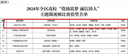 近日,由自治区教育厅组织开展的 2024 年全区高校 “资助筑梦 诚信铸人”主题微视频决赛顺利举行,我校7名学生共创的作品《筑梦归途,不忘初心》在比赛中荣获优秀奖。