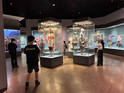 在“霓裳羽衣”专题展厅中,学生学习到民族纹样不仅是审美的载体,更是族群历史、信仰与生活的视觉叙事。侗族服饰上的“太阳纹”,寓意光明与生命,而壮族的“蛙纹”则与农耕文化息息相关。学生通过速写、摄影等方式记录纹样细节,为后续设计积累素材。