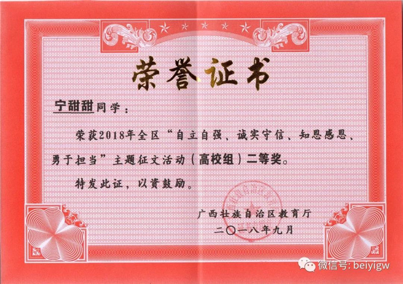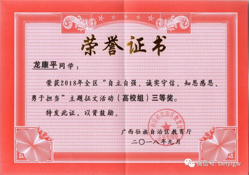 根据桂教资助〔2018〕28号文件精神,获悉我校在2018年全区“自立自强、诚实守信、知恩感恩、勇于担当”主题征文活动中喜获佳绩。