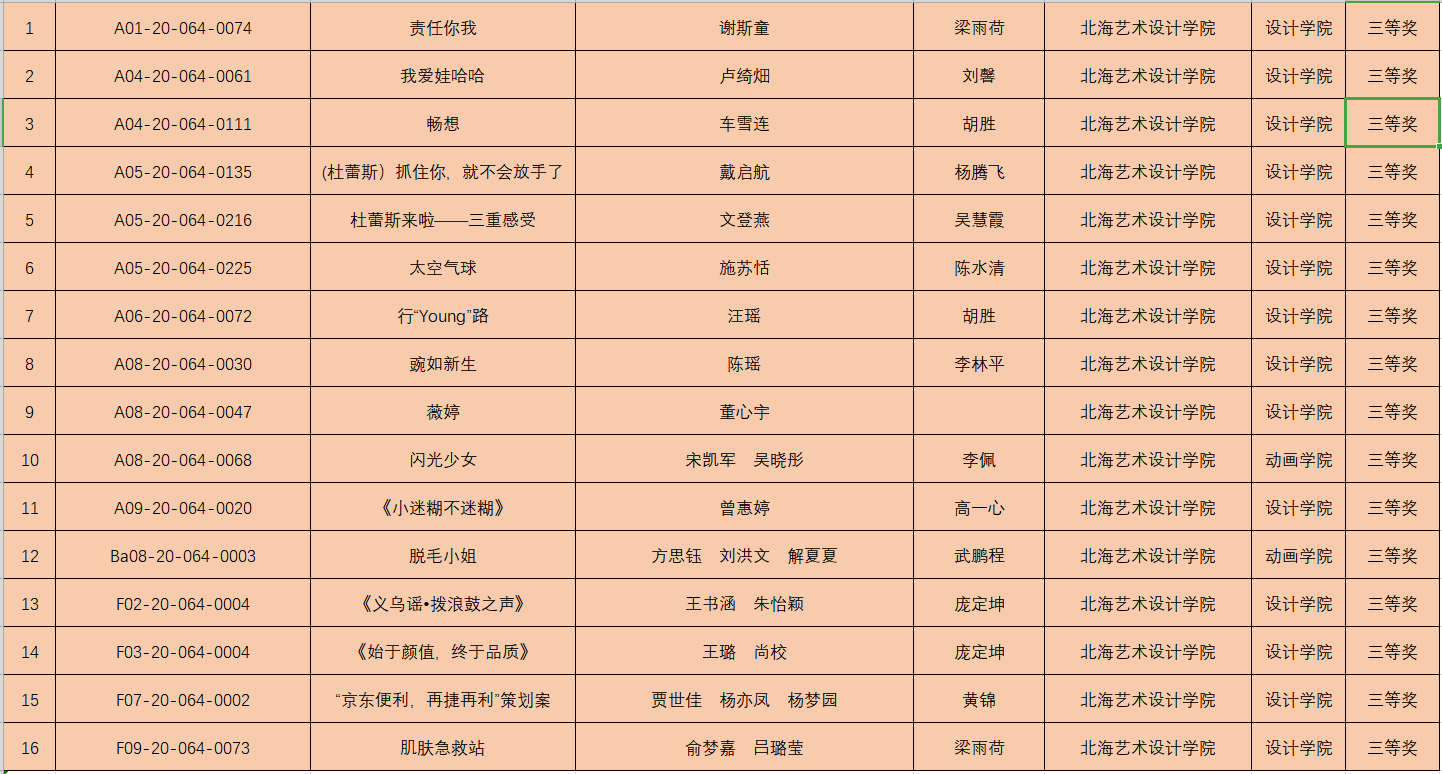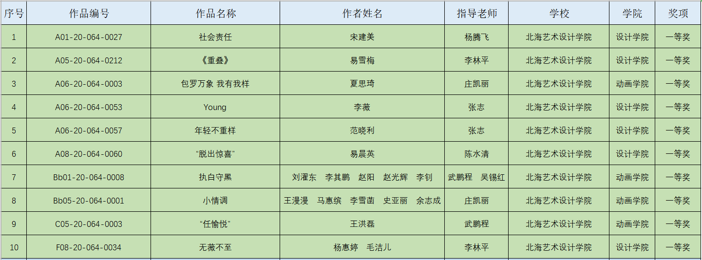 经过一个多月的紧张等待,第十一届全国大学生广告艺术设计大赛广西赛区评审结果终于出炉啦!在刚刚公布的获奖名单中,北海艺术设计学院共计获得了38项等级奖,其中获得一等奖的作品10项、二等奖12项、三等奖16项。本届大广赛,学校还获评为优秀组织院校,刷新了我校参赛的历史好成绩。