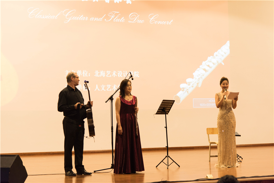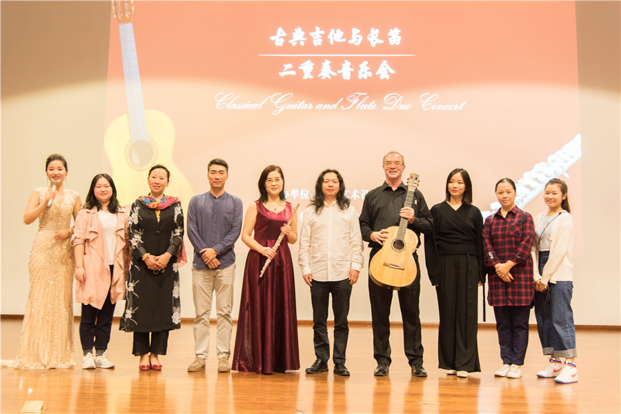 2019年10月31日晚,古典吉他与长笛二重奏音乐会在我校大礼堂成功举办,此次音乐会有幸邀请到来自法国的古典吉他演奏家埃瑞克·佛朗塞利和旅法长笛演奏家郝雪雯同台献演。两位艺术家为我校师生带来了一场精彩的视听盛宴!