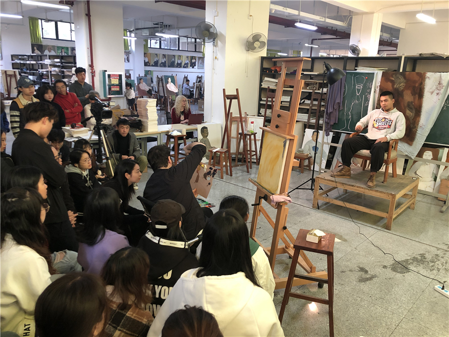 12月12日,美国芬兰迪亚大学艺术学院绘画系主任迪伦在美术学院绘画教室开展人像写生示范,现场吸引了许多师生前来积极观摩学习。