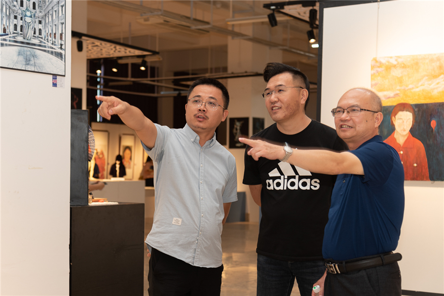 开幕仪式结束后,由美术学院常务副院长龚为以及美术学院教师陪同校领导参观,校领导点评了展览作品并提出了宝贵的建议,有助于提升今后的教学水平。